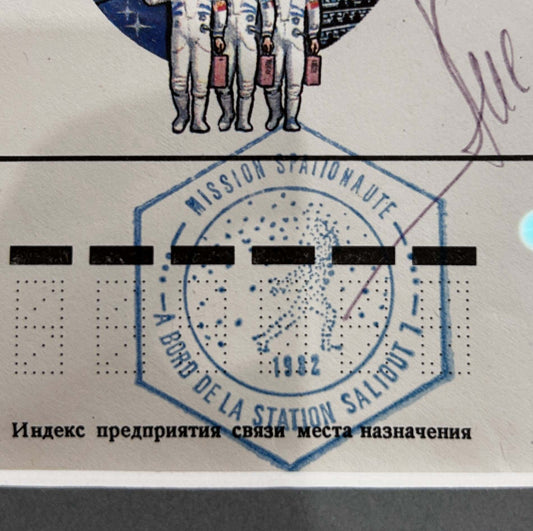 Enveloppe du Premier Jour - Mission SOYOUZ T6 - Tamponnée à bord de la Sation Spatiale SOYOUZ T6 - Signatures de l'équipage