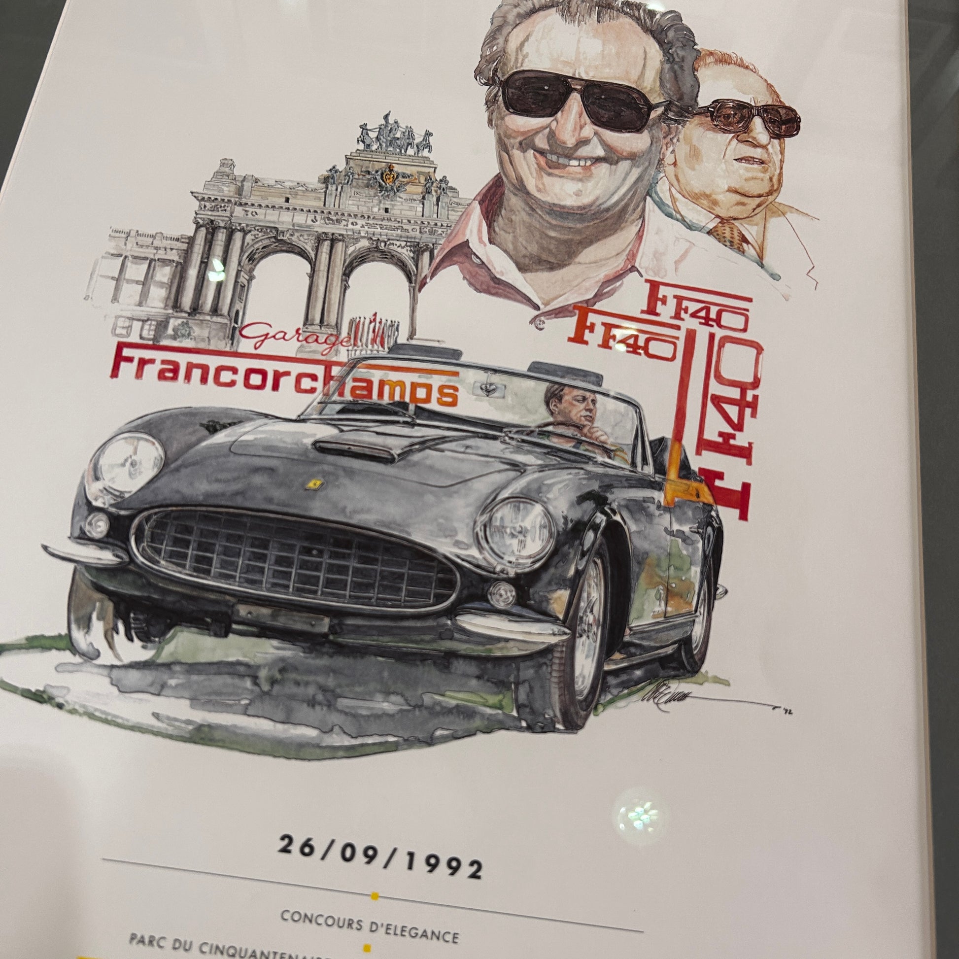 Affiche commémorative du partenariat de 40 ans avec Jacques Swaters et Ferrari de 1952-1992, présentant sa célèbre décapotable pour le roi Léopold de Belgique,