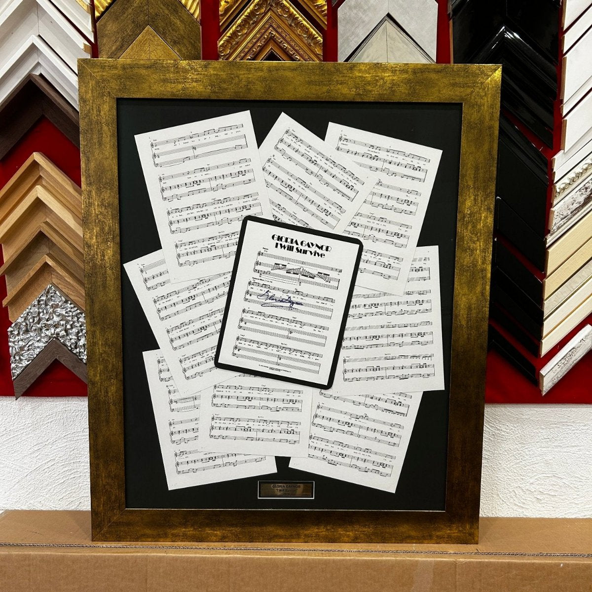 Cadre - Mise en valeur de la signature de Glaria Gaynor sur les partitions de la mythique chanson 'I Will Survive"