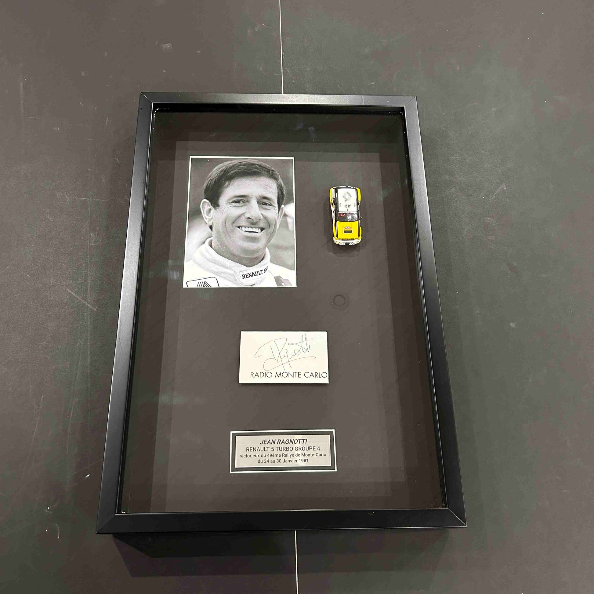 Cadre - Mise en valeur de la signature du pilote Jean Ragnotti et de la miniature de la Renault 5 Turbo Groupe 4 avec laquelle il a concouru au 49ème Rallye de Monte Carlo en 1981